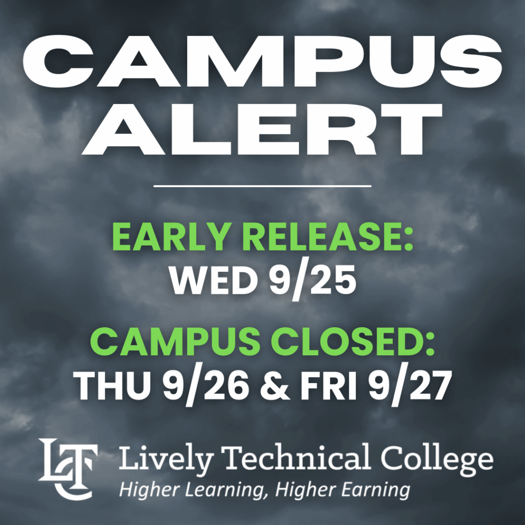 Lively Technical College will close early on Wednesday, September 25th at 12:00 PM (noon). The college will remain closed on Thursday, September 26th and Friday, September 27th due to the ...